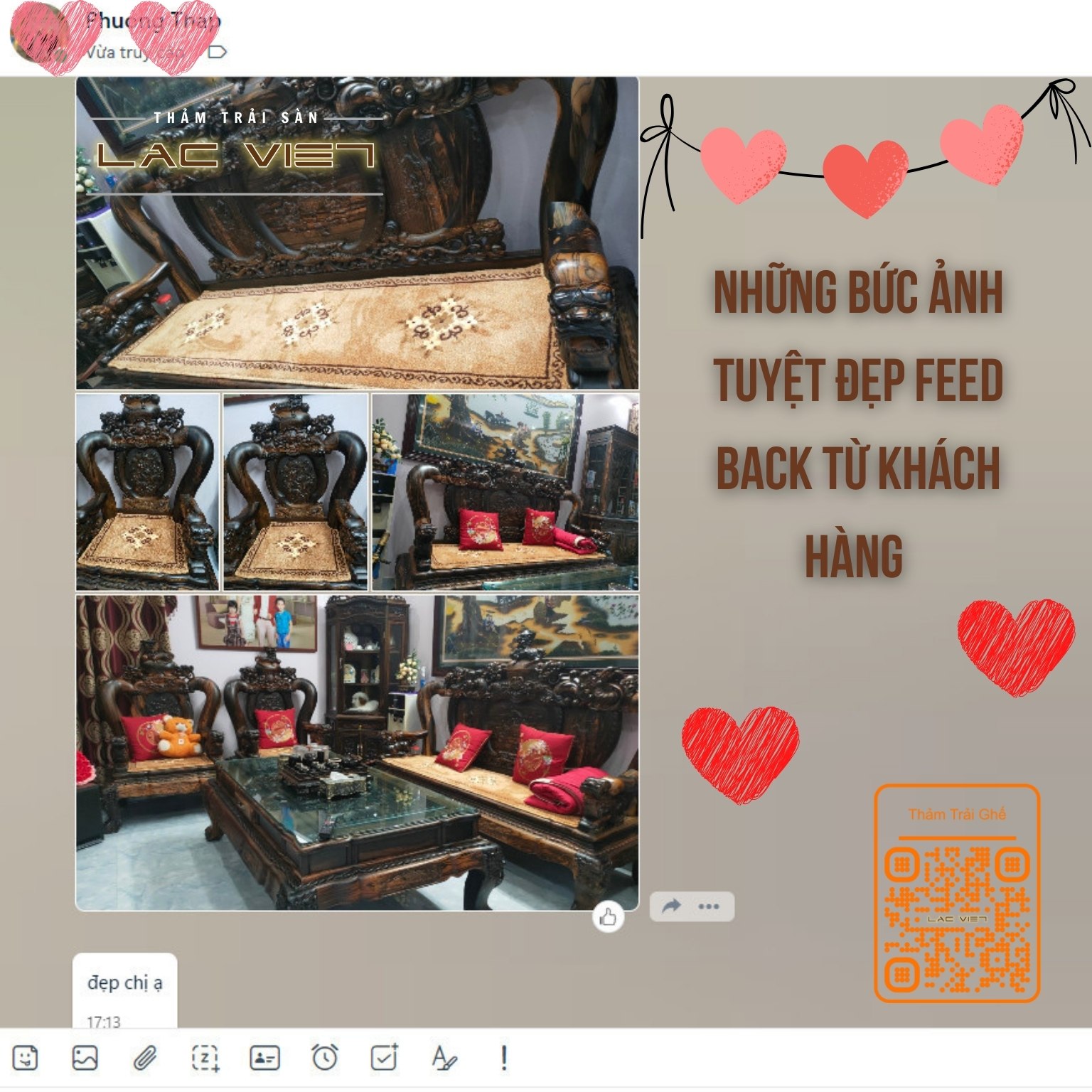 Bộ ghế Minh Nghê Bảo Đỉnh là biểu tượng của sự sang trọng và quyền quý, và khi kết hợp cùng thảm len dệt thủ công từ Lạc Việt, vẻ đẹp này càng được nâng tầm một cách tinh tế. Thảm len dệt tay với thiết kế đặc sắc mang đến sự hài hòa, làm nổi bật đường nét điêu khắc tinh xảo và giá trị thẩm mỹ độc đáo của bộ ghế.