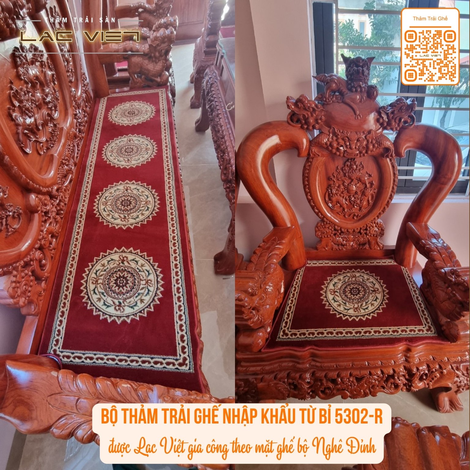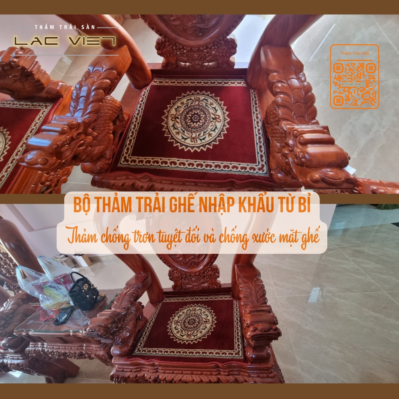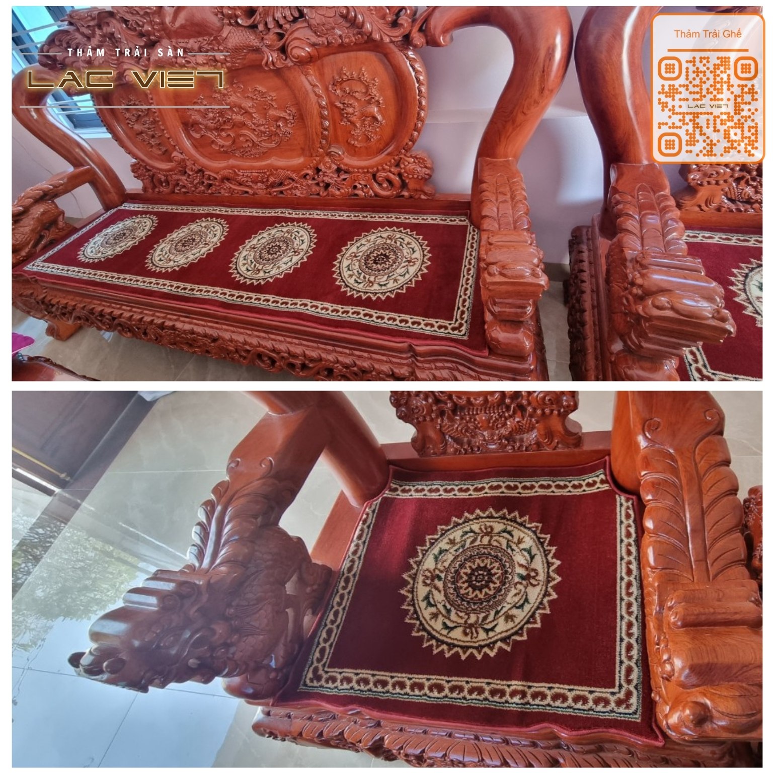 Lạc Việt giới thiệu thảm len Bỉ cao cấp với họa tiết trống đồng, hoàn hảo cho bộ ghế Nghê Đỉnh, mang đậm phong cách truyền thống và tạo điểm nhấn ấn tượng.