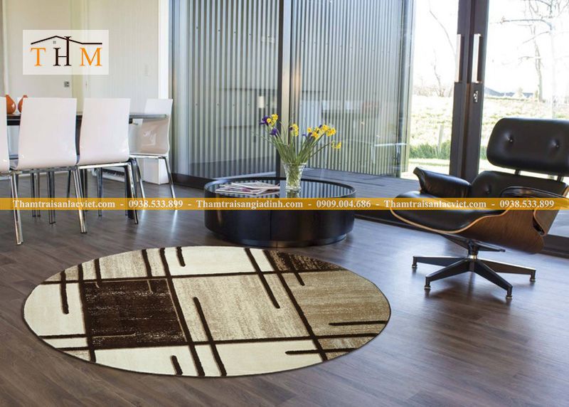 Trái ngược với kiểu dáng theo dạng hình chữ nhật, thảm tròn phòng khách hạn chế hơn về mặt ứng dụng. Nguyên nhân là do kích thước của thảm có các góc bằng nhau. Trong khi đó, thảm trang trí hình chữ nhật có một cạnh dài, một chiều ngắn phù hợp với phòng khách.