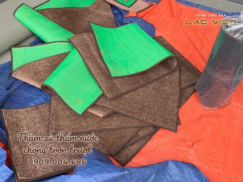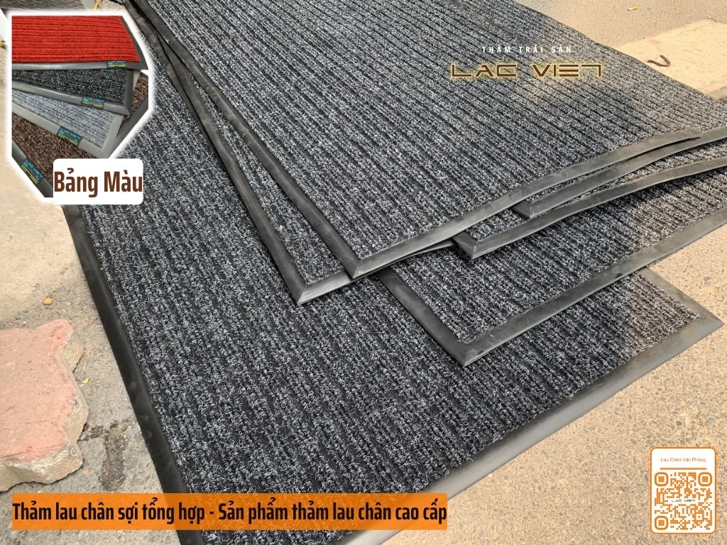 Thảm sợi tổng hợp đế cao su: Là thảm len hoặc sợi polyester dệt mịn, mặt dưới có đế cao su đen chống trượt. Ưu điểm của loại này là thấm hút tốt, bền lâu, màu sắc đẹp mắt và có thể in/thêu logo công ty. Thảm sợi tổng hợp thường có kích thước cố định (40×60 đến 120×180) hoặc cắt từ cuộn lớn tùy theo yêu cầu.